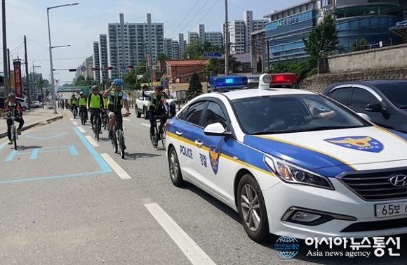 | 15일 조치원역 광장에서 지대 발대식을 갖고 조치원읍에서 자전거 퍼레이드를 벌이고 있는 세종시 자전거 순찰대.(사진제공=세종경철서) |