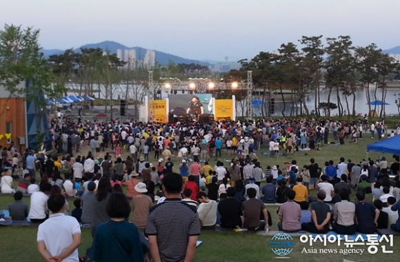 | 22일 오후?노무현 대통령의 서거 7주기를 맞아 ‘깨어있는 시민, 행동하는 양심’을 주제로 노무현재단 대전세종충남지역위원회가 주최한 시민문화제가 세종시 호수공원 야외무대에서 열리고 있다./아시아뉴스통신=홍근진 기자 |