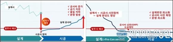 | 기존에 설계와 시공을 분리발주하던 관리 방식(왼쪽)과 시공책임형 건설사업관리 방식(오른쪽)의 비교 그래프.(사진제공=행복도시건설청) |