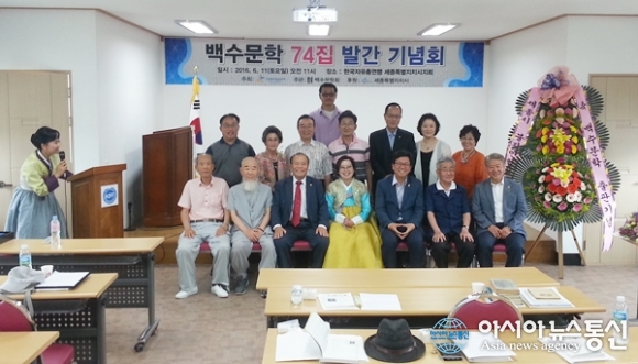 | 11일 국내 최장수 동인지중 하나로 알려진 백수문학(회장 박용희.앞줄 가운데) 창간 60주년 및 제74호 발간 기념식이 세종시 자유총연맹 회관에서 열렸다. 이 자리에는 임상전 시의장(앞줄 왼쪽 세번째), 최교진 교육감(앞줄 오른쪽 세번째) 등 내외 귀빈과 회원들이 참석했다. 1부 순서 마지막에 참석한 귀빈들과 동인지 회원이 함께한 기념촬영에서 사회자(박다혜 전 mbc 아나운서.사진 맨왼쪽)가 사진이 예쁘게 나오려면 “다같이 앙~ 하세요”라고 말하자 참석자들이 모두 웃고 있다./아시아뉴스통신=홍근진 기자 |