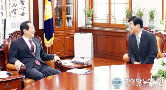 | 이춘희 세종시장이 21일 국회를 방문, 정세균 국회의장을 만나 국회분원 세종시 설치 및 세종~서울 고속도로 조기 착공을 건의하고 있다.(사진제공=세종시청) |