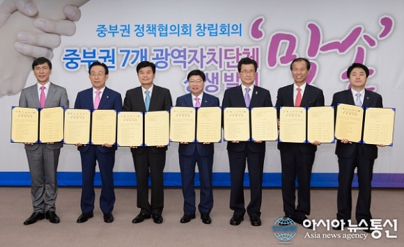 | 중부권 7개 시?도가 참여하는 중부권 정책협의회 창립총회가 21일 오후 대전시청에서 열렸다. 사진 왼쪽부터 안희정 충남지사, 김관용 경북지사, 이춘희 세종시장, 권선택 대전시장, 이시종 충북지사, 최문순 강원지사, 김일재 전북행정부지사.(사진제공=세종시청) |