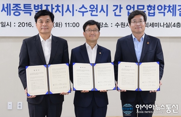 | 세종시가 28일 수원시청에서 산림청, 수원시와 제26회 나라꽃 무궁화 전국축제의 성공적인 개최 및 무궁화 보급 확대를 위해 업무협약을 체결했다. 사진 왼쪽부터 이춘희 세종시장, 신원섭 산람청장, 염태영 수원시장.(사진제공=세종시청) |