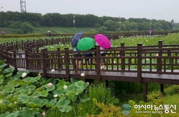 | 3일 비가 오는 가운데 일요일을 맞아 세종시 조칭원읍 평리에 있는 연꽃공원에 시민들이 산책을 나왔다. 연꽃과 함께 형형색색의 ‘우산꽃’이 활짝 피었다./아시아뉴스통신=홍근진 기자 |