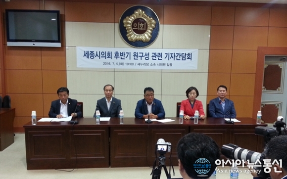 | 5일 세종시의회 3층 회의실에서 기자회견을 갖고 있는 새누리당 의원들./아시아뉴스통신=홍근진 기자 |