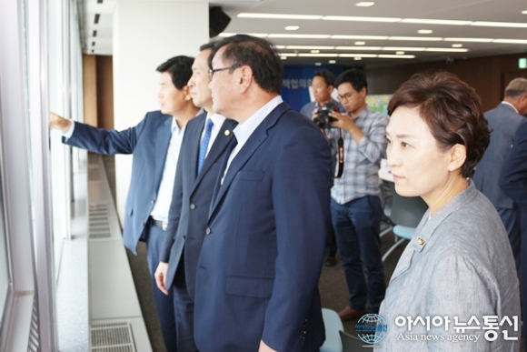 | 8일 오후 열린 세종시와 더불어민주당과의 ‘2016년 예산정책협의회’가 끝난후 이춘희 세종시장이 회의실 창으로 보이는 강 건너 국회 분원 예정지를 가리키며 설명하고 있다. 왼쪽부터 이 시장, 우상호 원내대표, 김태년 예결위 간사, 김현미 예결위원장./아시아뉴스통신=홍근진 기자 |