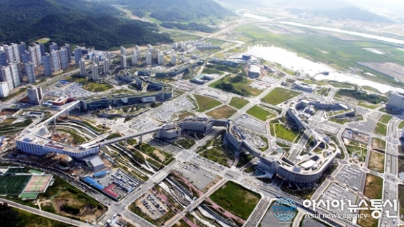 | 하늘에서 내려다 본 정부세종청사의 모습. 마치 하늘에서 내려 온 용의 모습을 하고 있다.(사진제공=행복도시건설청) |