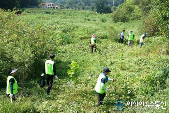 | 19일 연서면 고복저수지 일원에서 ‘가시박’ 제거 활동을 펼치고 있는 자원봉사자들.(사진제공=세종시청) |