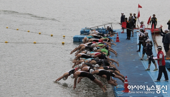 | 지난 2014년 경주 보문호수에서 열린 전국트라이애슬론 선수권대회 수영 장면./아시아뉴스통신 DB |