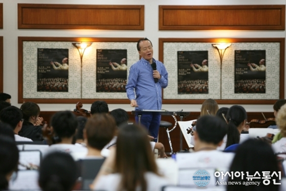 | 30일(천안)과 31일(과천) 두 차례 공연을 위해 세종시 소재 홍익대 국제연수원에서 연습이 한창인 농어촌희망청소년오케스트라(KYDO) 학생들을 지도하고 있는 지휘자 금난새 씨.(사진제공=농어촌희망재단) |
