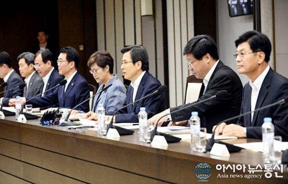 | 12일 정부세종청사에서 열린 제12차 세종시지원위원회를 주재하고 있는 황교안 국무총리(오른쪽 세번째)와 종합운동장 건립을 건의한 오른쪽 끝에 이춘희 세종시장.(사진출처=국무총리실) |