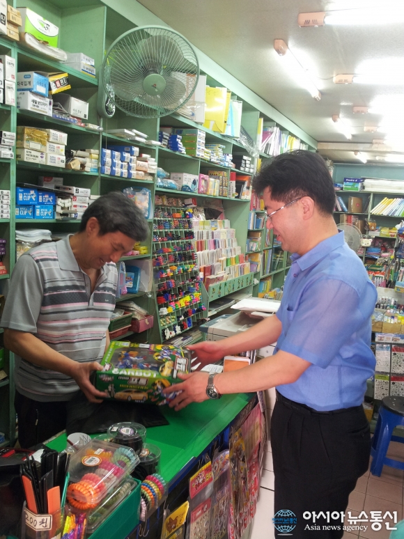 | 13일 인천시 계양구 작전재래시장에서 아이들 장난감을 사고 있는 이도형 국민의당 디지탈 소통위원장(오른쪽)의 모습./아시아뉴스통신=김선근 기자 |