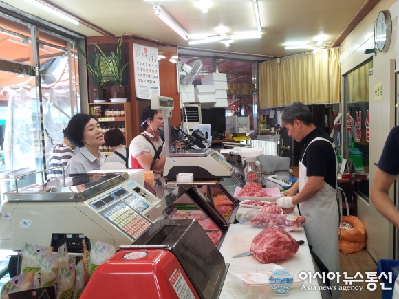 | 13일 인천시 계양구 작전재래시장에서 정육점 장보기를 하는 조계자 시의원(왼쪽)의 모습./아시아뉴스통신=김선근 기자 |