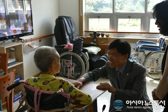| 새누리당 최교일 의원(경북 영주·문경·예천)이 추석 연휴 첫째날인 14일 지역 한 복지시설을 찾아 노인에게 덕담을 건네고 있다.(사진제공=최교일 국회의원 사무실) |