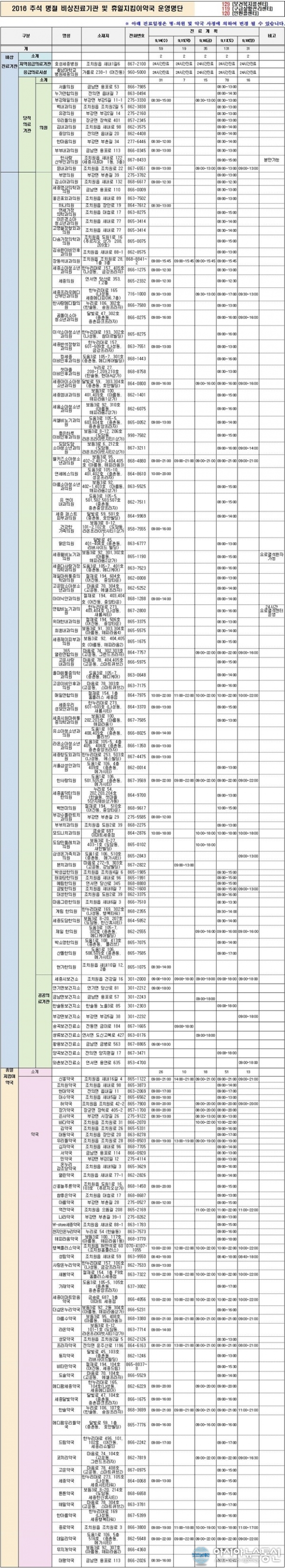 세종시 추석명절 비상진료기관 및 휴일지킴이약국 명단은 다음과 같다.