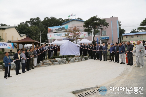 | 19일 경북 상주시 사벌면사무소 전정에서 열린 '사벌 면민헌장 선포 및 면민 노래비 제막식'에서 이정백 상주시장, 안희성 사벌면장 등이 행사에 참석한 인사들과 함께 기념비 제막식을 갖고 있다./아시아뉴스통신=김철희 기자 |