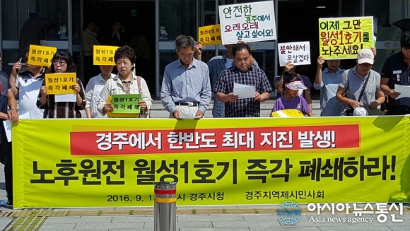 지난 13일 경주지역 시민사회단체는 경주시청에서 기자회견을 열고 "정부와 한수원은 30년 수명이 끝난 월성1호기에 대해 즉각 폐쇄 조치를 단행해야 한다"고 성명서를 발표했다.