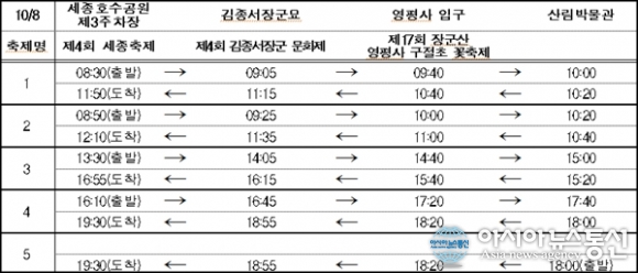 | 오는 8일 운행하는 세종시 시티투어 버스 탑승지별 시간표.(자료출처=세종시청) |