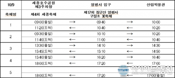 | 오는 9일 운행하는 세종시 시티투어 버스 탑승지별 시간표.(자료출처=세종시청) |