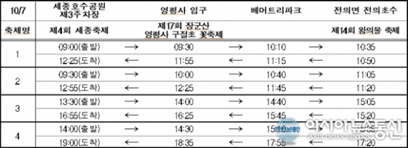 | 오는 7일 운행하는 세종시 시티투어 버스 탑승지별 시간표.(자료출처=세종시청) |