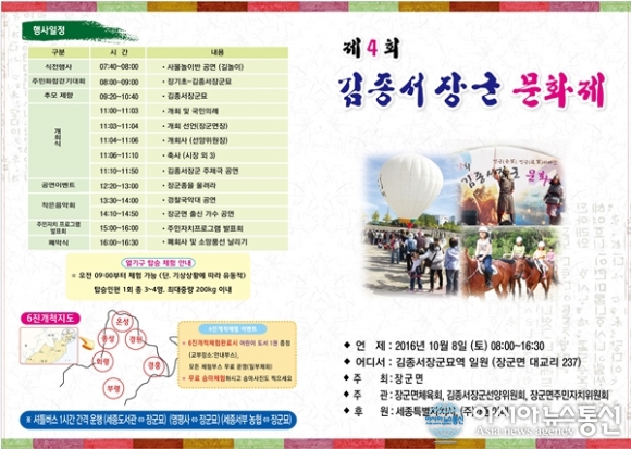 박덕규 장군면장은 “세종대왕이 가장 신임했던 김종서 장군의 호국정신을 배우고 기리는 역사문화 축제가 될 수 있도록 차질없이 준비하겠다”며 많은 관광객의 방문을 당부했다.