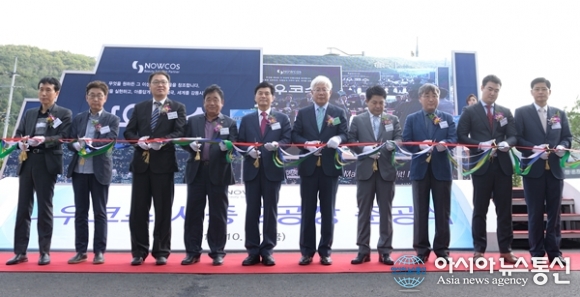 | 7일 세종시 소정면 고등리 첨단산업단지에서 열린 (주)나우코스의 제2공장 준공식에서 이춘희 세종시장(왼쪽다섯번째)과 노향선 나우코스 대표(여섯번째)를 비롯한 내빈들이 테이프커팅을 하고 있다.(사진제공=세종시청) |