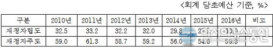 또 2016년도 재정력지수는 56%로 전국 157개 시.군 지방자치단체 중 32위를 기록했다.