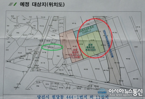 | 당진3동사무소가 당진시에 건의한 도시계획지정 건의한 위치도. 위 사진에서 녹색부분 진입로 사용승락조건으로 공유재산심의를 받고 빨간부분의 도시계획지정건의를 통해 새로운 진입로를 개설해 달라는 위치도./아시아뉴스통신=하동길기자 |