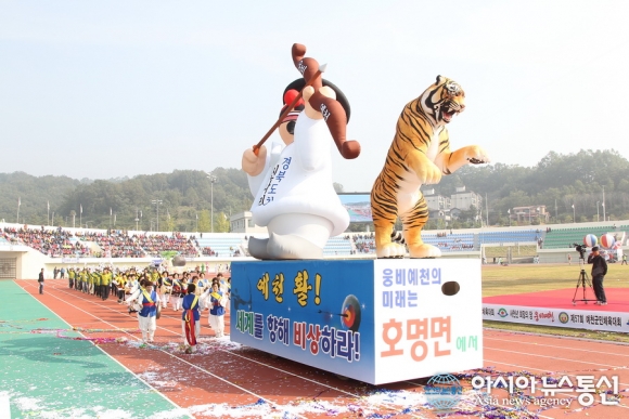 | 15일 개막된 예천군민체육대회 선수단 입장식에서 호명면이 활과 호랑이를 이용한 모형물을 선보이고 있다.(사진제공=예천군청) |