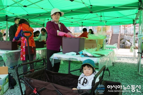 | 12일 세종시 도담동 싱싱장터에서 열린 ‘로컬푸드 김장 한마당’ 행사에 참여한 이화란(65) 할머니가 김장을 하는 동안 손녀인 표가온(4) 어린이는 유모차에 앉아 놀고 있다./아시아뉴스통신=홍근진 기자 |