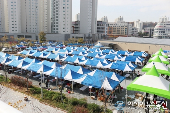 | 12일 세종시 도담동 싱싱장터에서 열린 ‘로컬푸드 김장 한마당’ 행사를 위해 설치한 텐트가 장관을 이루고 있다./아시아뉴스통신=홍근진 기자 |