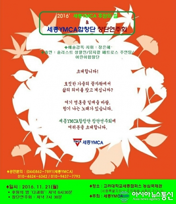 | 세종시 YMCA가 오는 21일 오후 6시 30분부터 고려대 세종캠퍼스 농심국제관에서 후원의 밤과 합창단 창단연주회를 갖는다. 사진은 행사 포스터.(사진제공=세종YMCA) |