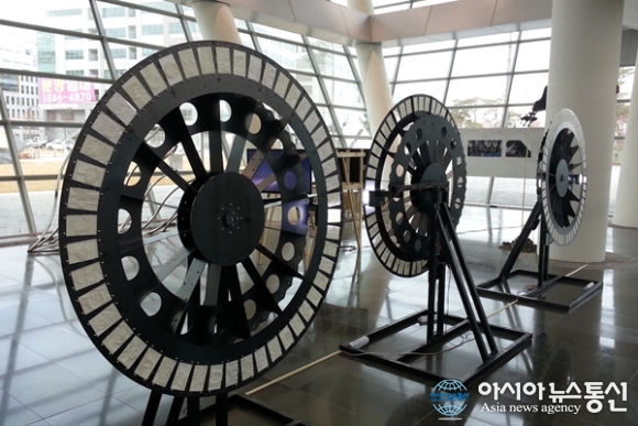 | 25일까지 세종시청 로비에서 ‘비욘드 아트스튜디오’가 전시하고 있는 바람개비 모양의 키네틱 아트. 시민들의 모습을 담은 3D 역부조 입체필름이 빛을 받으면 보이게 돼 있는데 마치 옛날 영사기를 닮았다./아시아뉴스통신=홍근진 기자 |