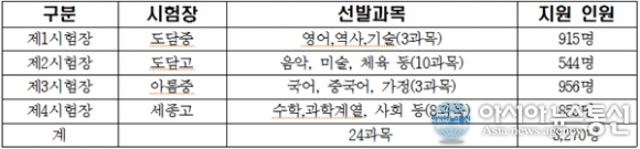 오전 9시에 시작된 시험은 과목별로 학교를 달리해 진행됐다. 영어, 역사, 기술 과목은 도담중에서 음악, 미술, 체육 등 예체능 과목은 도담고. 국어, 중국어, 가정 과목은 아름중. 나머지 수학, 과학계열과 사회 등은 세종고등학교에서 치러진다.