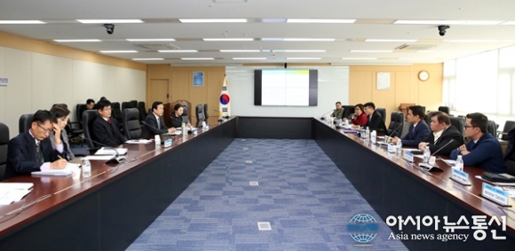 | 5일 행복도시건설청 회의실에서 이충재 건설청장 등이 알프레도 베니테즈 필리핀 의원 등과 세종시 신도시 건설에 대해 이야기를 나누고 있다.(사진제공=행복도시건설청) |
