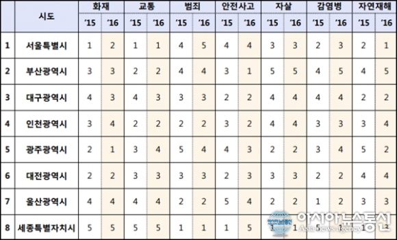 | 8일 국민안전처가 발표한 전국 시도별 2015년, 2016년 지역안전등급 비교표.(자료출처=국민안전처) |
