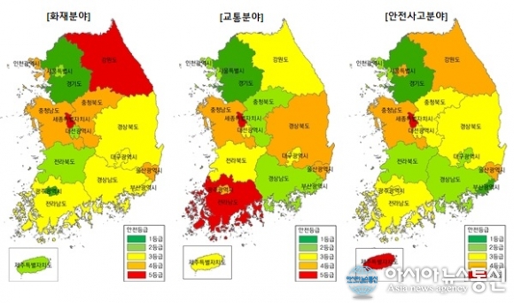 | 8일 국민안전처가 발표한 전국 화재, 교통, 안전사고분야 지역안전지수 지도.(사진출처=국민안전처) |