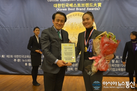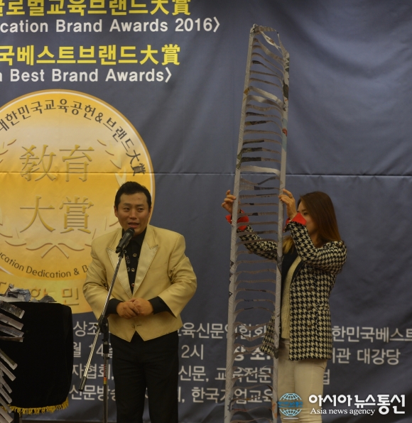 | 14일 서울 여의도 국회도서관에서 제2회 대한민국교육대상&2016 글로벌교육브랜드대상 시상식이 열린 가운데 조성호 smilingface연구소 대표가(오른쪽) 교육공헌대상을 수상하고 있다./아시아뉴스통신=이승주 기자 |