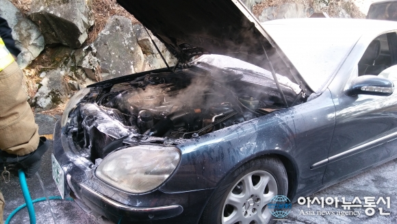 | 1일 오후 12시쯤 범어사 매표소 앞에 정차 중인 차량에서 화재가 발생해 구조대원이 진화하고 있다.(사진제공=부산소방본부) |