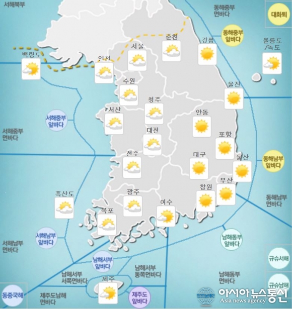 아침 최저기온은 영하 4도에서 영하3도의 분포를 보이겠고 낮 최고기온은 9도에서 10도로 전날보다 높을 것으로 보인다.