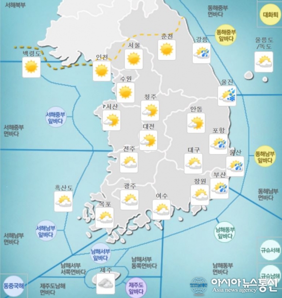 아침 최저기온은 영하 4도에서 영하 1도의 분포를 보이겠고 낮 최고기온은 9도에서 10도로 전날보다 낮거나 비슷할 것으로 보인다.