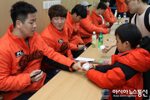 | 롯데자이언츠 선수들이 6일 오전 10시 30분 고신대학교복음병원 장기려기념암센터에서 팬 사인회를 하고 있다.(사진제공=고신대학교복음병원) |