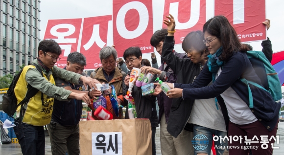 | 서울 광화문 광장 앞에서 시민단체의 옥시 불매운동 퍼포먼스를 진행하고 있다./아시아뉴스통신DB |