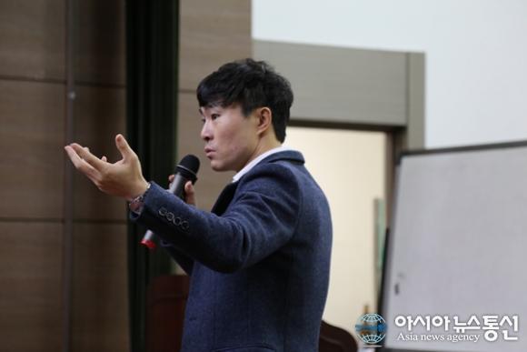 | 박일봉 대한기능재활운동협회 대표가 14일 동의과학대학교 정보관 세미나실에서‘헬스케어 마케팅' 강연을 진행하고 있다./아시아뉴스통신=박재환 기자 |