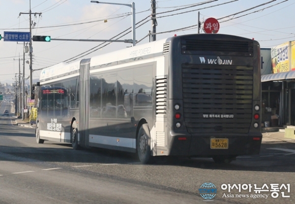 | 세종시와 행복청이 도입을 검토중인 대량수송이 가능한 대형 BRT 버스가 조치원~신도시 구간을 시험운행하고 있다./아시아뉴스통신=홍근진 기자 |