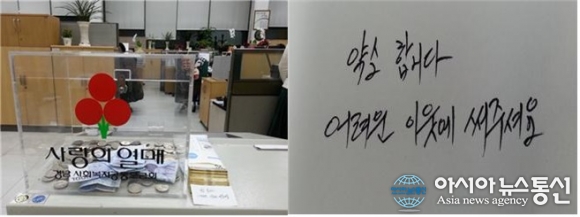 | 창원시청 사회복지과에 설치된 ‘사랑의 모금함’과 한 독지가가 남기고 간 성금 800만원과 메모.(사진제공=창원시청) |