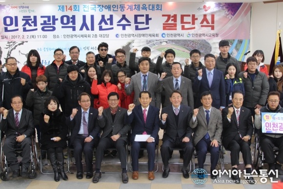 | 7일부터 제14회 전국장애인동계체육대회 인천광역시 선수단 결단식이 열린 가운데 인천시장애인아이스하키 임원과 바로병원팀 선수들이 파이팅 하며 기념 촬영을 하고 있다.(사진제공=남구바로병원) |