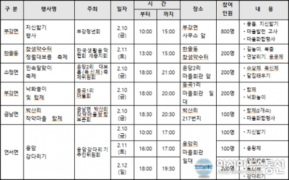부강면사무소 앞마당에서 오전 10시부터 지신밟기 행사가 열리고 오후 6시부터 소정면 운당2리 마을회관에서 민속달맞이 축제가 열린다.