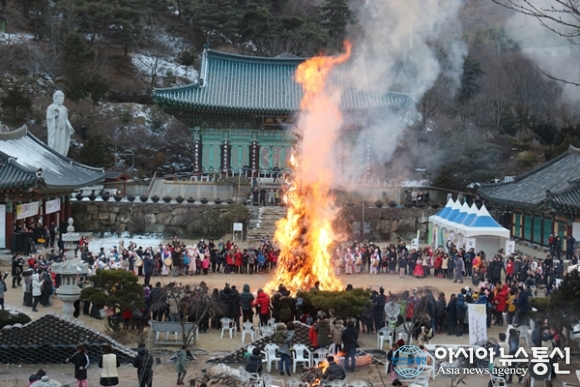 | 11일 세종시 장군면 영평사에서 정월 대보름 맞이 달집태우기 행사가 열려 500여명의 신도와 시민들이 달집 주위에서 올 한해 가족의 건강과 나라의 안정을 기원하는 가운데 달집에 붙은 불이 하늘로 솟구치고 있다./아시아뉴스통신=홍근진 기자 |