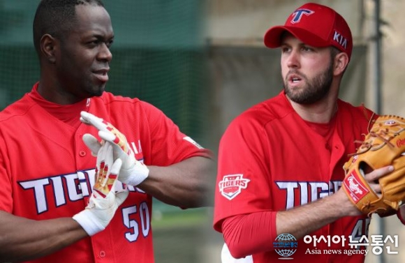 | 기아 타이거즈 외야수 버나디나(왼쪽)와 투수 팻 딘(오른쪽).(사진출처=기아 타이거즈) |